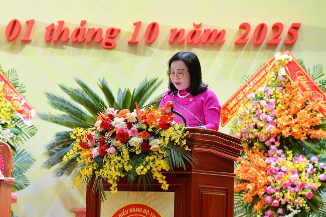 Đồng chí Cao Thị Hòa An, Phó Bí thư Thường trực Tỉnh ủy, Chủ tịch Hội đồng nhân dân tỉnh trình bày tóm tắt Báo cáo kiểm điểm sự lãnh đạo, chỉ đạo của Ban Chấp hành Đảng bộ tỉnh nhiệm kỳ 2020 - 2025.