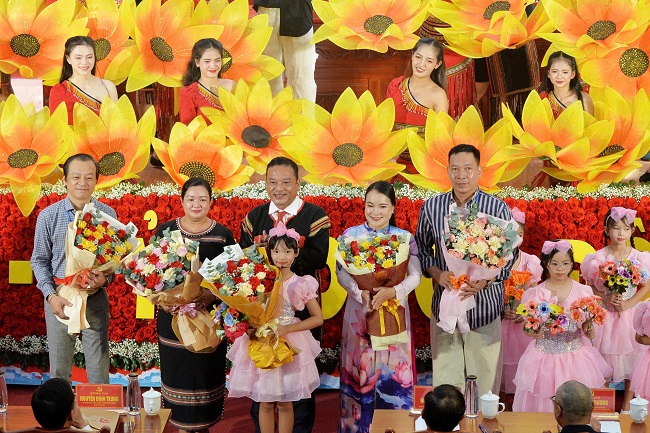 Đồng chí Y Giang Gry Niê Knơng - Chủ tịch Ủy ban MTTQ Việt Nam tỉnh Đắk Lắk, tân Phó Bí thư Tỉnh ủy nhiệm kỳ 2025-2030 tặng hoa cho đội văn nghệ.