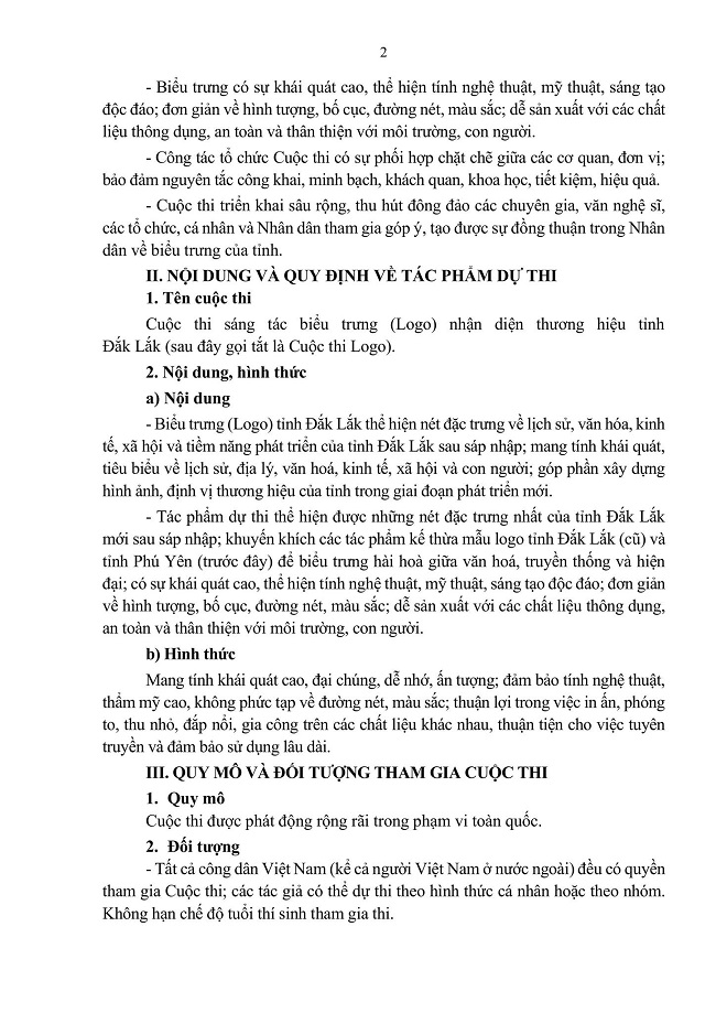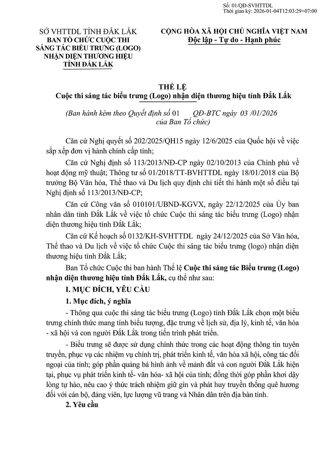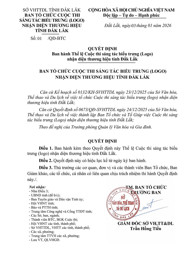 Với mục đích nâng cao hình ảnh và khẳng định vị thế văn hóa - du lịch của tỉnh Đắk Lắk sau khi sáp nhập hai tỉnh Đắk Lắk và Phú Yên (01/07/2025), Ban Tổ chức Cuộc thi sáng tác biểu trưng tỉnh Đắk Lắk vừa chính thức ban hành Thể lệ cuộc thi sáng tác biểu trưng (Logo) nhận diện thương hiệu tỉnh Đắk Lắk.