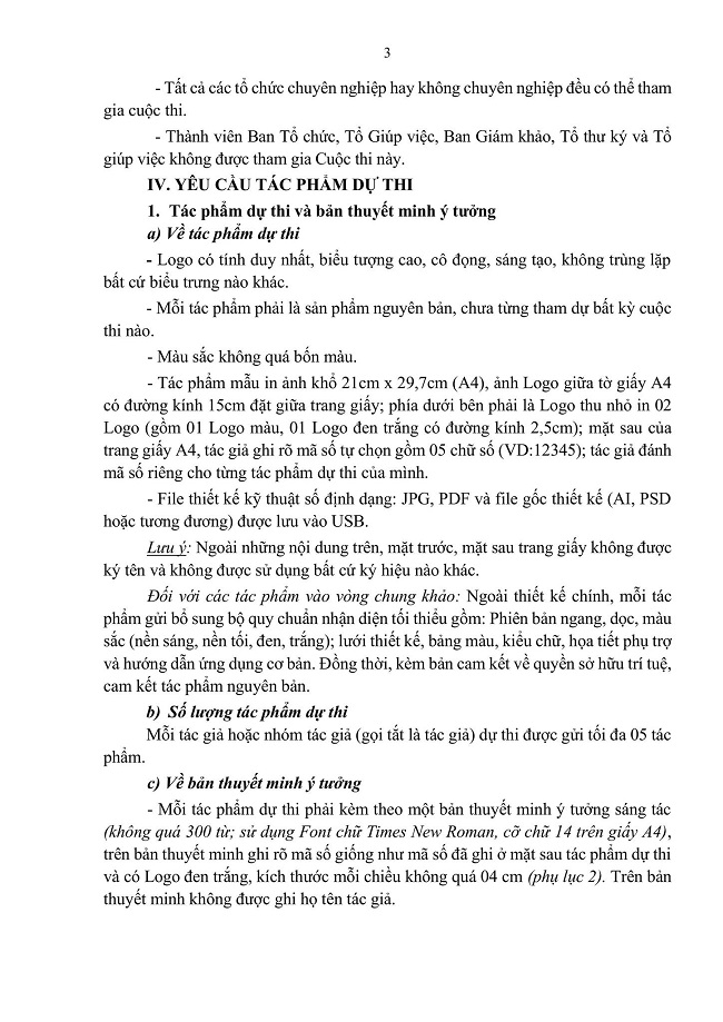 Cuộc thi mở rộng cho mọi đối tượng là các tổ chức, cá nhân trên phạm vi cả nước, kể cả người Việt Nam ở nước ngoài. Thời hạn nhận tác phẩm từ ngày ban hành Quyết định đến hết ngày 30/01/2026. Hồ sơ bắt buộc gồm: Mẫu thiết kế (Logo): Thể hiện trên khổ giấy quy định (thường là A4), bao gồm một mẫu lớn đặt giữa và một mẫu nhỏ (trắng đen hoặc kích thước tối thiểu) để kiểm tra khả năng ứng dụng; Bản thuyết minh ý tưởng; Phiếu đăng ký dự thi ghi rõ họ tên, địa chỉ, số điện thoại liên lạc.