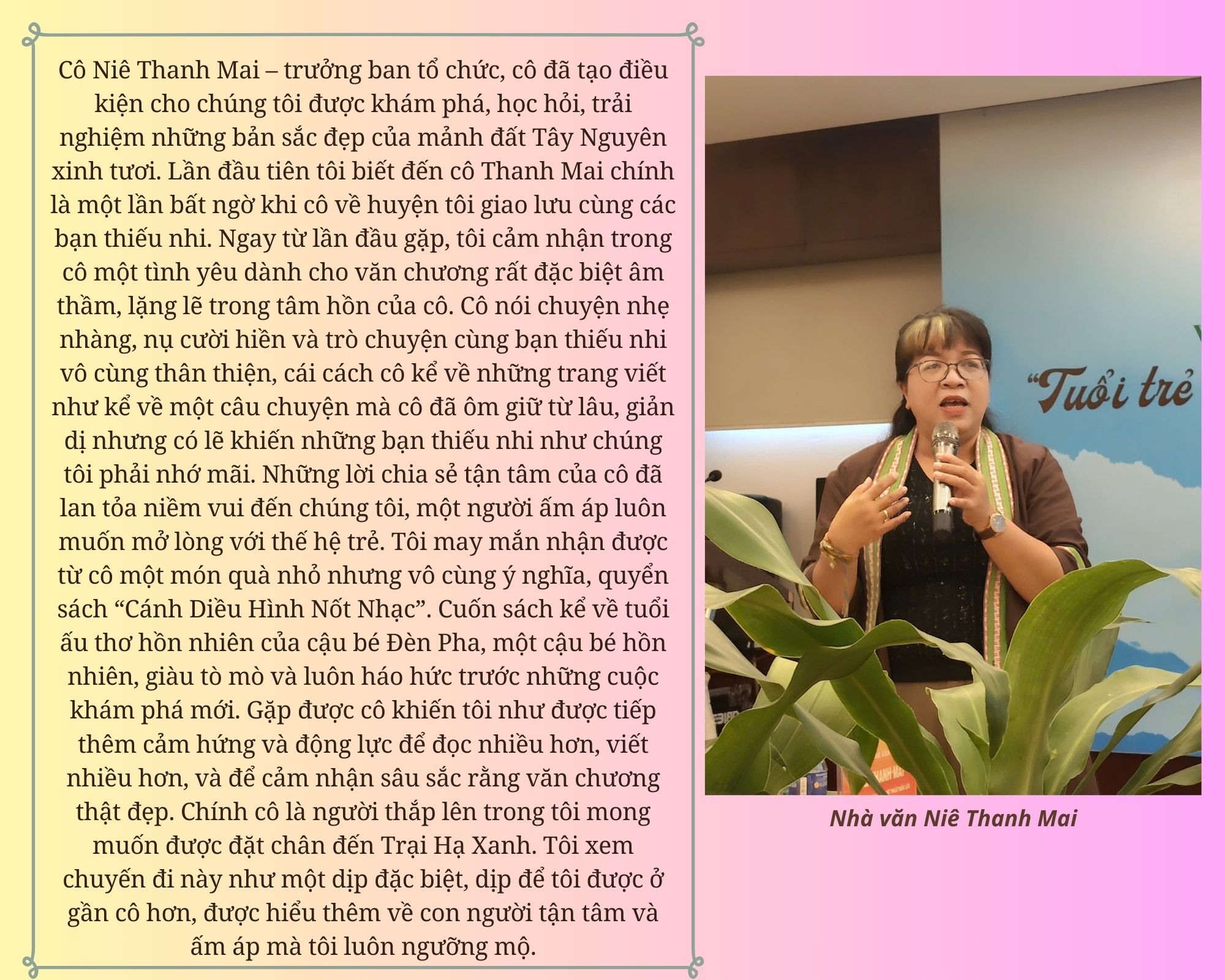 Kết thúc chuyến đi, lòng tôi vẫn còn đầy những âm vang đẹp. Tôi hiểu thêm về nơi mình lớn lên, yêu văn hóa Tây Nguyên hơn, và đặc biệt là học được cách nhìn thế giới bằng ánh mắt trân trọng hơn, sinh động hơn. Chuyến Trại Hạ Xanh 2025 không chỉ là một cuộc tham quan, mà là hành trình chạm đến văn hóa, thiên nhiên và trái tim của tôi. Nó khiến tôi lớn hơn, hiểu biết nhiều hơn và biết giữ gìn những giá trị đẹp đẽ của mảnh đất mà mình đang sống. Nó còn giúp tôi học hỏi được nhiều điều hay, bổ ích và vô cũng ý nghĩa. Tôi tin rằng nhiều năm sau, khi nhớ lại, trái tim tôi vẫn sẽ bồi hồi như khi nghe tiếng cồng chiêng vang lên, vẫn nhớ đến những thầy cô, anh chị bạn bè đã đồng hành cùng tôi trong hành trình ấy.