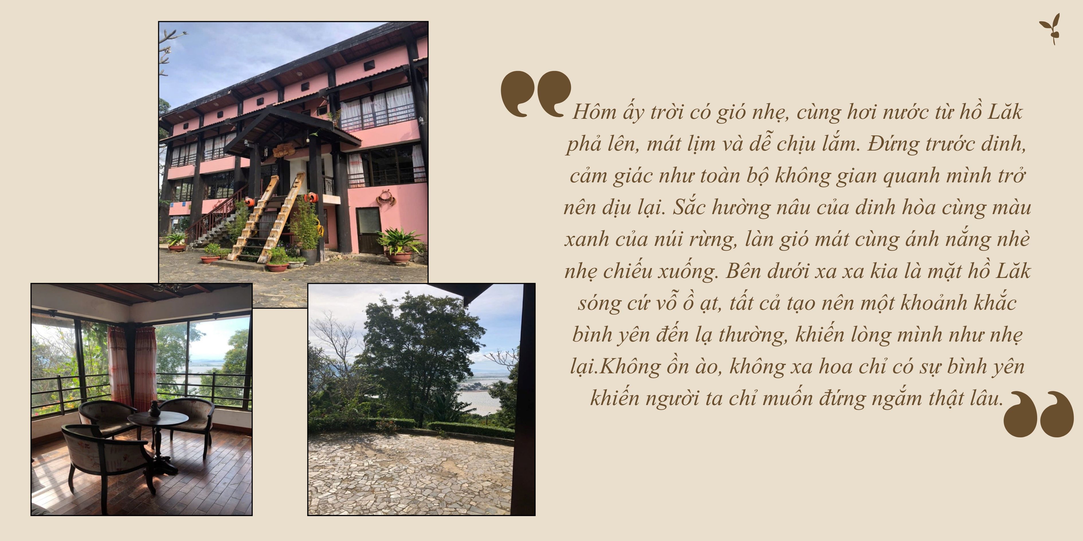 Bước vào dinh, không gian trầm ấm, tĩnh lặng. Những căn phòng cũ, những khung cửa sổ lớn nhìn ra núi rừng khiến tôi cảm nhận rõ một nét gì đó uy nghi nhưng cô độc. Những vật dụng còn lại trong dinh gợi tôi nghĩ về một thời lịch sử đã đi qua nhưng vẫn âm thầm sống trong từng căn phòng bức tường, từng chiếc bàn, chiếc ghế. Dinh khiến tôi trầm lắng hơn. Tôi cảm thấy mình đang đi giữa hai thế giới một nửa của hiện tại sống động, một của quá khứ yên bình và có phần lặng lẽ.