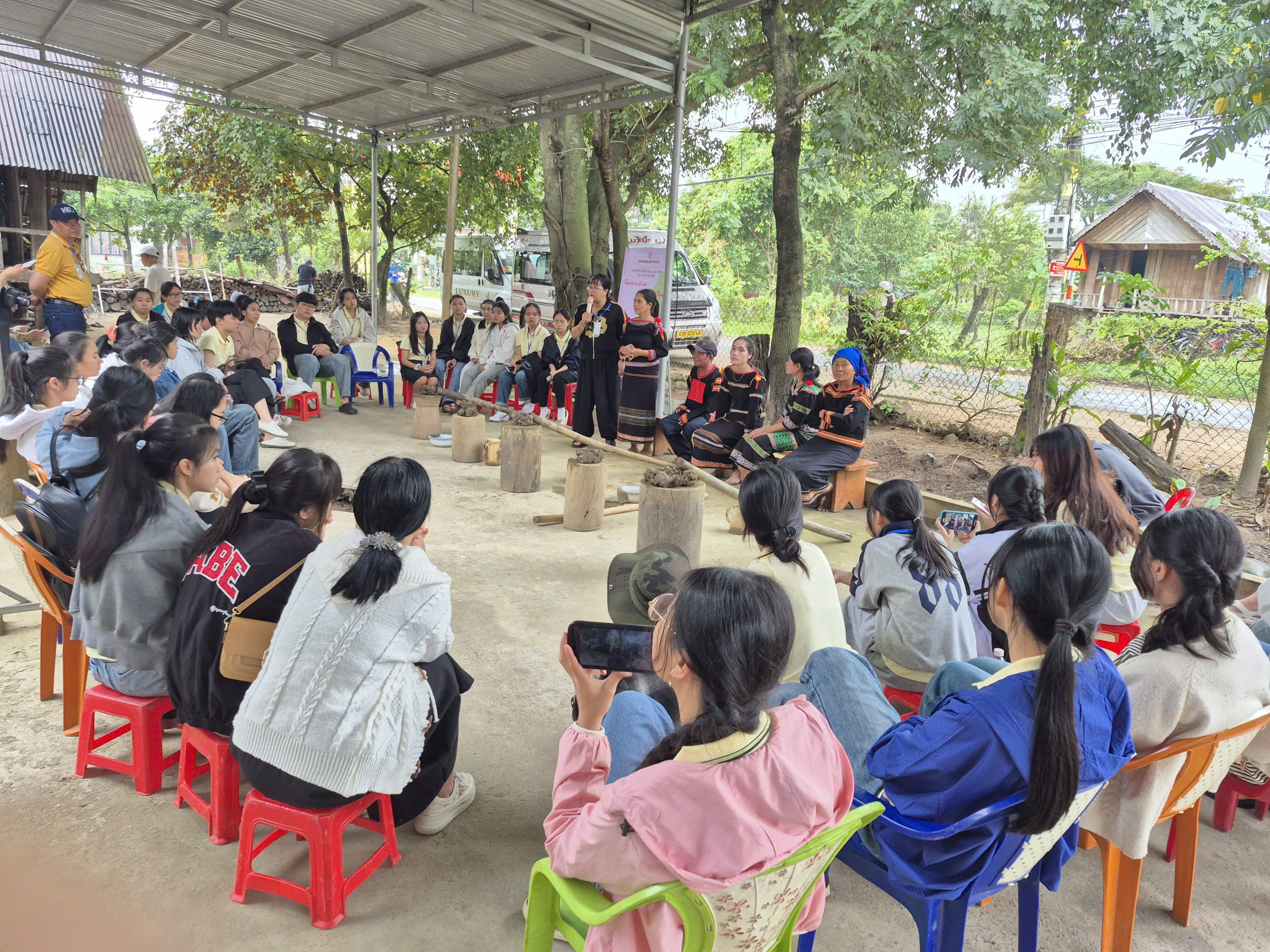 Một ngày mới bắt đầu chúng tôi di chuyển đến làng Yang Tao là nơi tôi vô cùng thích thú. Trên đường đến làng Yang Tao hai bên đường bạt ngàn là những cánh đồng xanh ngắt, những cánh cò bay, những chú trâu thi nhau gặm cỏ…Đến làng,các cô chú nghệ nhân đón tiếp đoàn chúng tôi thật vui vẻ và thân thiện, được nghe các cô chú chia sẻ nhiều điều hay về truyền thống làm gốm của người M’nông: lấy đất sét từ đâu, sơ chế đất như thế nào... Chúng tôi được xem các cô chú tự tay làm từ những chiếc bình, nồi, những chú voi đất… những cô chú thợ gốm làm việc nhẹ nhàng mà chăm chú, vừa khéo léo, tỉ mỉ hăng say bởi đây vừa là công việc yêu thích của các cô chú, vừa góp phần bảo tồn truyền thống dân tộc. Đất sét sau khi lấy về thì giã kỹ, đập để tơi, làm sạch tạp chất. Khi tạo hình, các cô chú đặt khối đất lên một tấm gỗ lớn, rồi đi xung quanh để tạo hình, dùng que tre mỏng, vải ướt hoặc vòng tre để định hình sản phẩm. Từng khối đất sét được nhào nặn thành hình dáng, rồi khắc những hoa văn tượng trưng cho văn hóa M’nông.