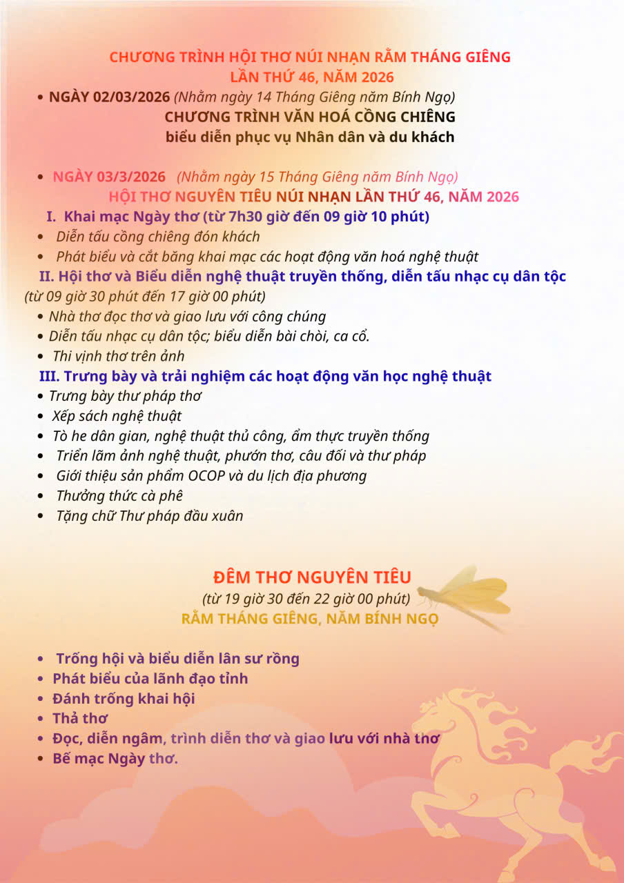 Hội thơ Nguyên tiêu lần thứ 46 tại Di tích Quốc gia đặc biệt Tháp Nhạn sẽ được tổ chức vào các ngày 02 và 03/03/2026 (nhằm ngày 14 và 15 tháng Giêng năm Bính Ngọ). Đây là sự kiện trọng tâm nằm trong chuỗi hoạt động của Ngày thơ Việt Nam tỉnh Đắk Lắk năm 2026 với chủ đề “Đắk Lắk – Vượt sóng vươn xa, vươn tầm cao mới”.