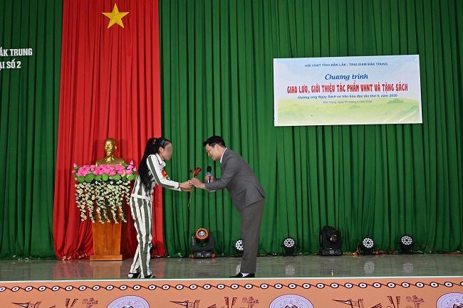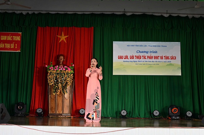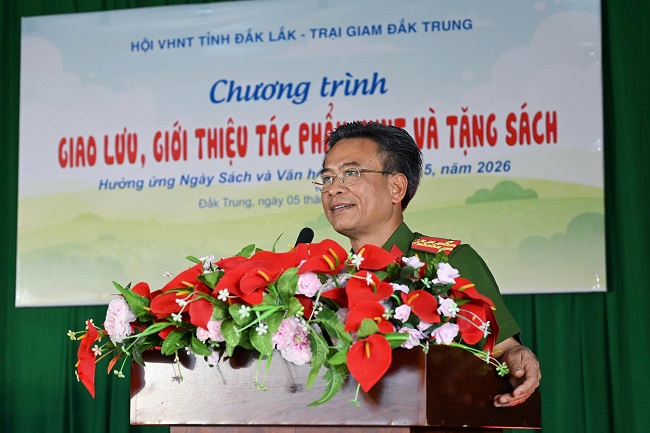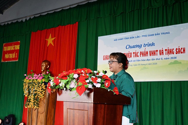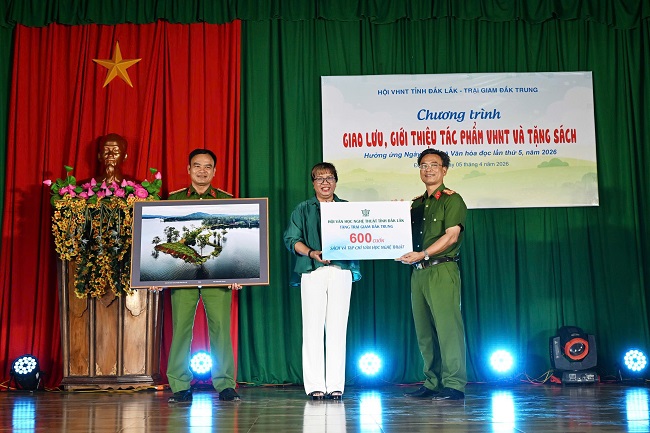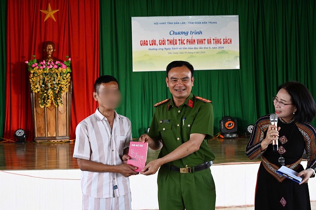 Đại tá Trần Văn Dũng – Giám thị Trại giam Đắk Trung khẳng định việc nâng cao đời sống tinh thần là yếu tố quan trọng giúp các phạm nhân yên tâm cải tạo, rèn luyện. Dịp này, Nhà văn Niê Thanh Mai – Chủ tịch Hội VHNT tỉnh đã đại diện tặng tác phẩm nghệ thuật và 600 cuốn sách, tạp chí chuyên ngành cho thư viện trại giam. Đây là món quà tinh thần giá trị, góp phần lan tỏa văn hóa đọc và làm phong phú thêm hoạt động văn nghệ của cán bộ, chiến sĩ và phạm nhân tại đây.