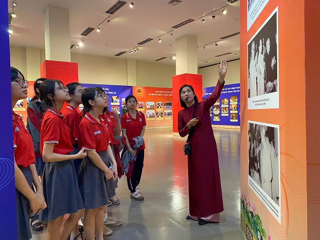 Các em học sinh tìm hiểu lịch sử của Quốc hội Việt Nam qua ảnh.
