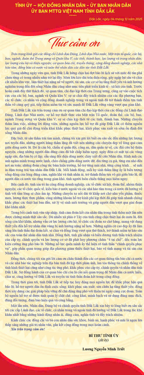 Thay mặt Tỉnh ủy, HĐND, UBND, Ủy ban MTTQ Việt Nam tỉnh, Ủy viên dự khuyết Ban Chấp hành Trung ương Đảng, Bí thư Tỉnh ủy Đắk Lắk Lương Nguyễn Minh Triết đã có Thư cảm ơn gửi đến các đồng chí Lãnh đạo Đảng, Nhà nước, Mặt trận Tổ quốc; các bộ, ngành đoàn thể Trung ương và Quân khu V; các tỉnh thành bạn; lực lượng vũ trang, cứu hộ, thiện nguyện, báo chí; cộng đồng doanh nghiệp, nhà hảo tâm và toàn thể đồng bào cả nước đã hướng về Đắk Lắk bằng những hành động nhân ái, dũng cảm, nghĩa tình và đầy trách nhiệm.