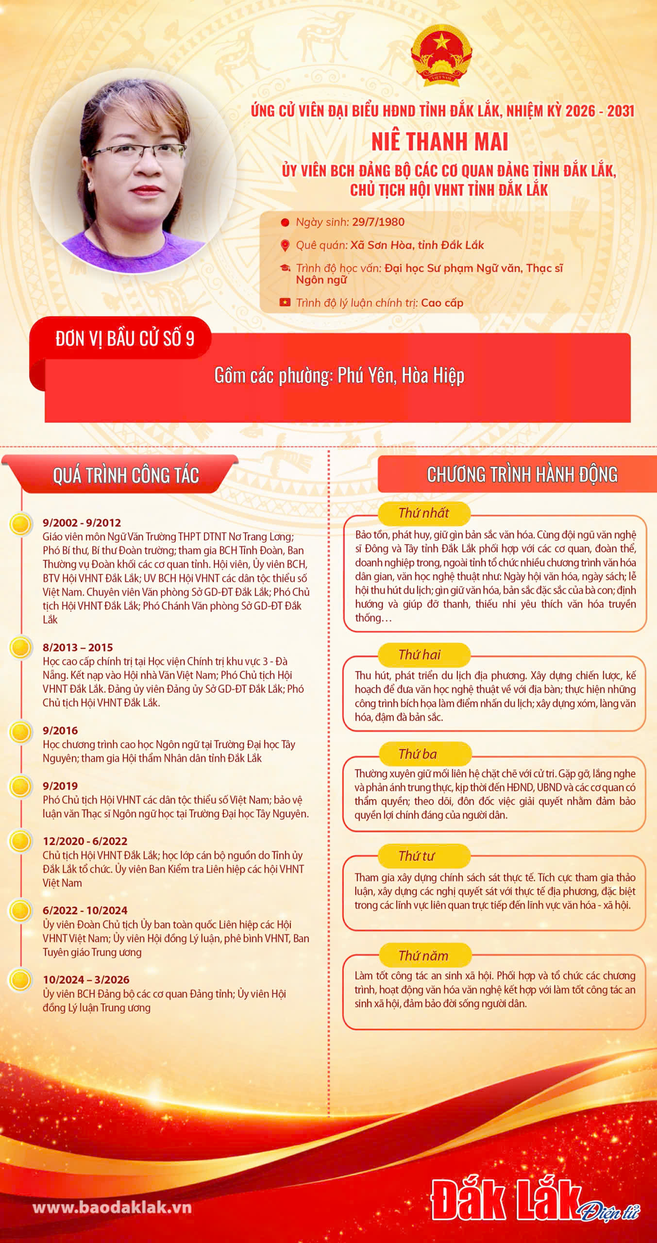 Tóm tắt Chương trình hành động Nhà văn Niê Thanh Mai, Chủ tịch Hội VHNT tỉnh - ứng cử viên đại biểu HĐND tỉnh Đắk Lắk, nhiệm kỳ 2026 - 2031 - Đơn vị bầu cử số 9 tỉnh Đắk Lắk