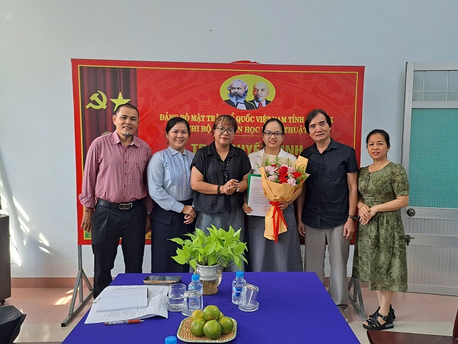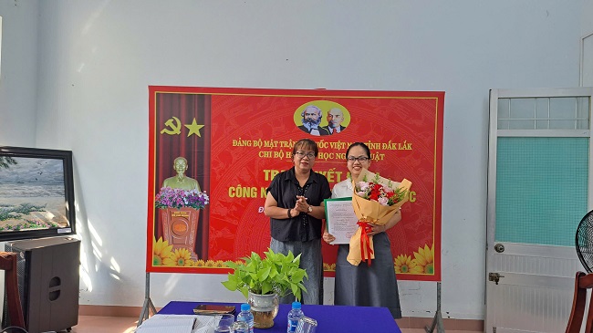 Thay mặt chi bộ đồng chí Niê Thanh Mai đã trao quyết định và chúc mừng đồng chí Nguyễn Ngọc Đan Giao, đồng thời đề nghị đồng chí đảng viên mới tiếp tục rèn luyện phẩm chất chính trị; không ngừng nâng cao năng lực chuyên môn để hoàn thành tốt mọi nhiệm vụ được giao.