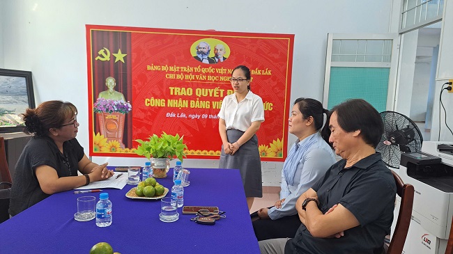 Bí thư chi bộ, Chủ tịch Hội VHNT Niê Thanh Mai trao Quyết định công nhận đảng viên chính thức. Ảnh: Tú Oanh